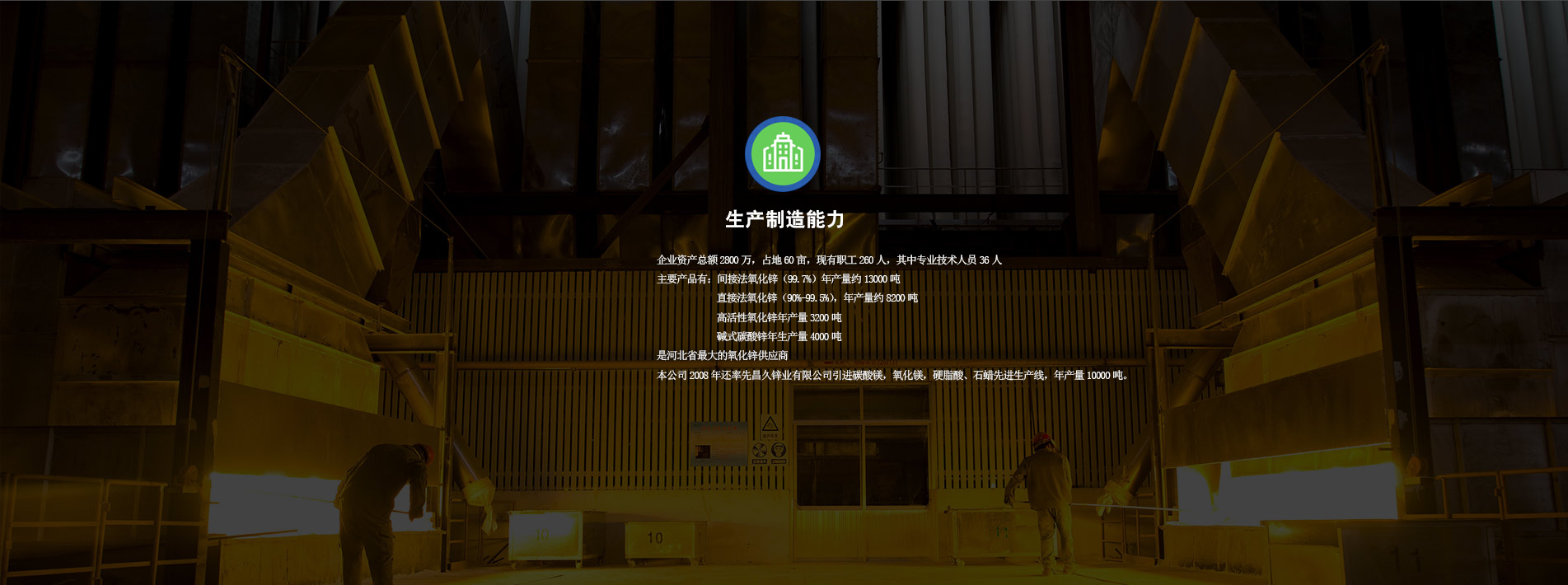 公司創(chuàng)建于1989年,公司座落在美麗的太行山下,107國(guó)道、京深高速、京廣鐵路貫穿高邑南北,交通十分便利.地理位置十分優(yōu)越. 企業(yè)資產(chǎn)總額2800萬(wàn),占地60畝,現(xiàn)有職工130人,其中專(zhuān)業(yè)技術(shù)人員16人,主要產(chǎn)品有間接法氧化鋅(99.7%)年產(chǎn)量約10000噸,直接法氧化鋅(90%-99.5%),年產(chǎn)量約5000噸.高活性氧化鋅年產(chǎn)量3000噸,堿式碳酸鋅年生產(chǎn)量3000噸、是河北省氧化鋅優(yōu)質(zhì)供應(yīng)商。本公司2008年還率先引進(jìn)碳酸鎂,氧化鎂,硬脂酸、石蠟先進(jìn)生產(chǎn)線(xiàn),年產(chǎn)量6000噸。